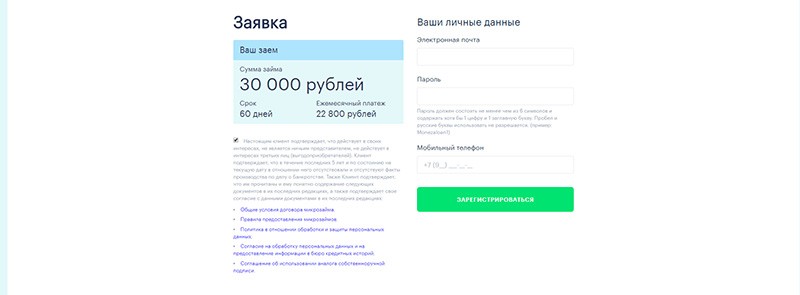 Начальный этап включает в себя ознакомление с документацией и внесение персональных данных заемщика. После ознакомления с информацией следует кликнуть на кнопку «Зарегистрироваться». Вся процедура заявки на получения займа в МФО Монеза состоит из пяти этапов.